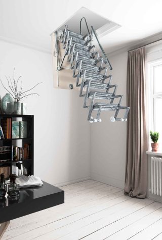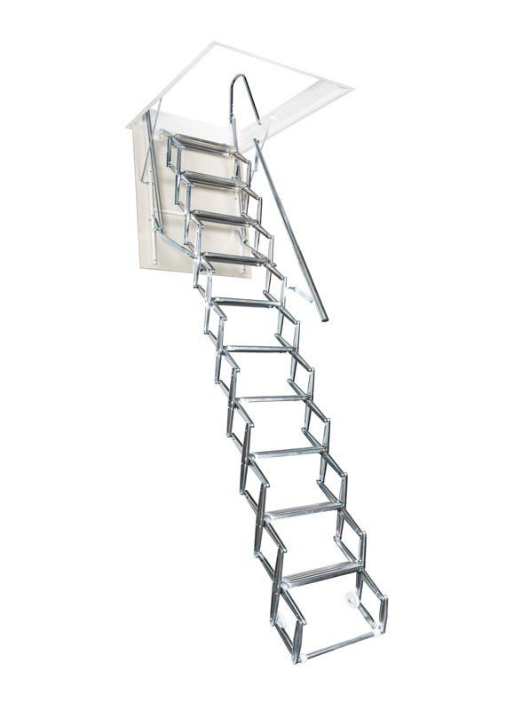 Escalera escamoteable de pantógrafo en aluminio con sistema motorizado.